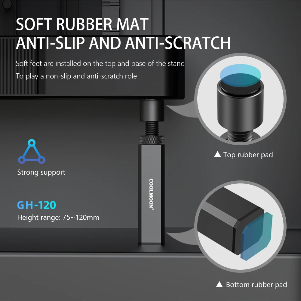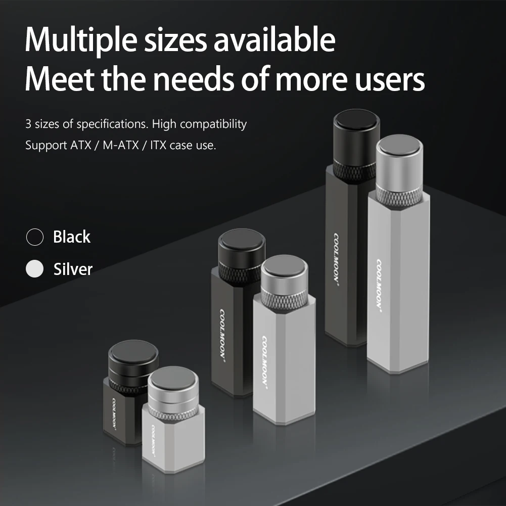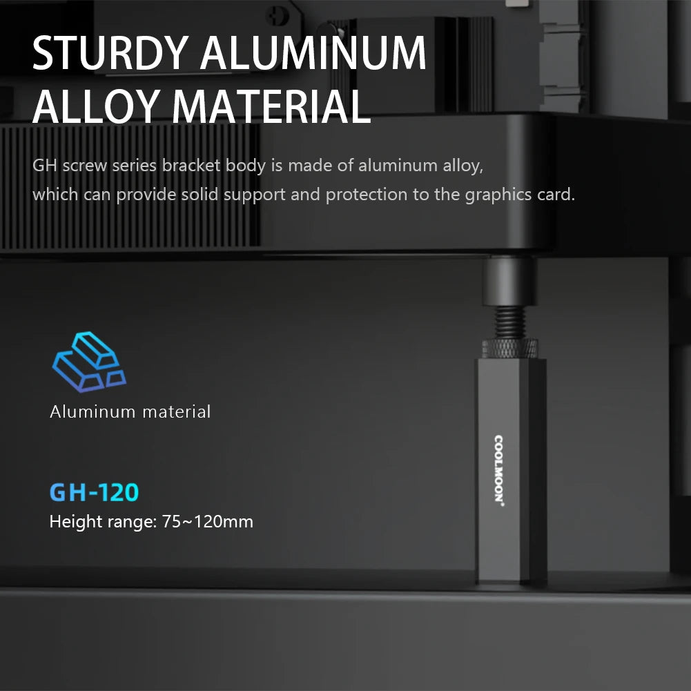 Feature: 1. Telescopic Spiral Design: The graphics card bracket adopts a telescopic screw design. The GH-50 can provide a height support range of 28-50mm, the GH-80 can provide a height support range of 50-80mm, and the GH-120 can provide a height support range of 75-120mm. Free height adjustment, suitable for various specifications of chassis. Provide effective support for the rear of the graphics card and provide protection for the graphics card. 2. Aluminum Magnesium Alloy Material: The material of Magnalium provides strong and lasting support and is durable. The surface has undergone sandblasting and anodizing treatment, with excellent oxidation resistance and outstanding texture, lasting for a long time. 3. Magnetic Suction Anti-slip Safety Protection: Both ends are equipped with anti slip rubber pads, making it easy for users to install and firmly stand in the chassis without scratching it. The bottom adopts a magnetic suction design, which can be adsorbed on iron materials such as the power compartment and chassis bottom plate, providing stable adsorption and support. 4. Strong Compatibility: The GH screw series bracket is small and exquisite, with a sturdy and stable appearance design, solid and stable, and fearless in the face of various large graphics cards; Compatible for traditional ATX, M-ATX, and ITX chassis structures, adjustable height to meet user needs 5. Graphics Card Protection Support Rod Function: High order graphics cards are expensive and large in size, and most chassis do not provide additional graphics card support protection. The graphics card support frame has emerged, which can provide effective support for the tail of the graphics card, keeping the high-level graphics card in a parallel state and reducing its failure rate. Specification: Origin: Mainland China Brand: COOLMOON Models: GH-50: 28 to 50mm GH-80: 50 to 80mm GH-120: 80 to 120mm Color: Black, Silver (optional) Material: Aluminum alloy Surface treatment: Anodized sandblasting Scope of application: for Traditional ATX/M-ATX/ITX chassis structure, graphics card Size: GH-50: 28x15mm, can extend to 50mm GH-80: 50x15mm, can extend to 80mm GH-120: 75x15mm, can extend to 120mm Weight: GH-50: 20g GH-80: 35g GH-120: 45g Note: ![]()